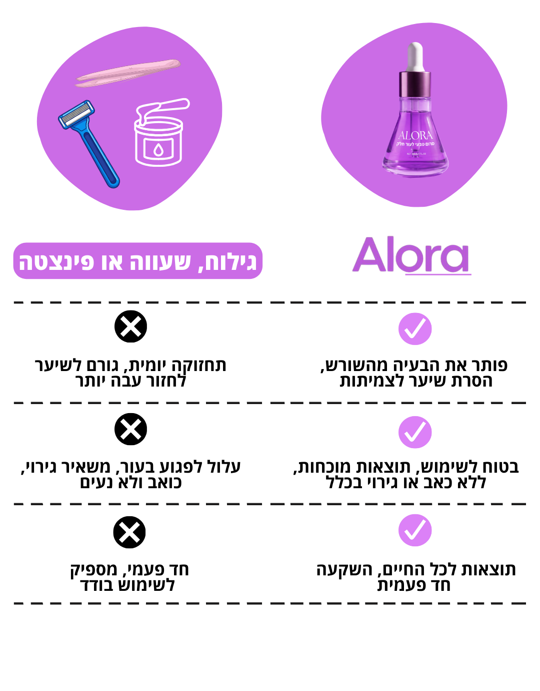 מהלקוחות מדווחות על זמן ממוצע גבוה יותר בין גילוח לגילוח וחווית גילוח קלה יותר לאחר השימוש בalora.